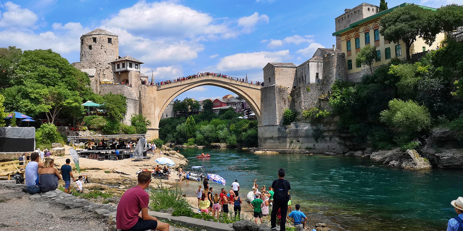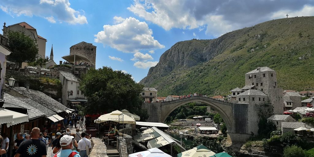Ich schlendere zurück und überquere die Brücke, von der man einen herrlichen Blick auf die sich zu beiden Seiten erstreckende Altstadt hat. Gleichzeitig überquere ich allerdings auch eine noch immer in den Köpfen fest verankerte ethnische Grenze: Von der kroatischen Westseite der Stadt in die bosniakische Ostseite. In einem Gespräch mit einem Einheimischen wird mir deutlich, dass eine Annäherung der beiden verfeindeten Volksgruppen auch heute, fast 25 Jahre nach Kriegsende, ein noch sehr lange andauernder Prozess sein wird.